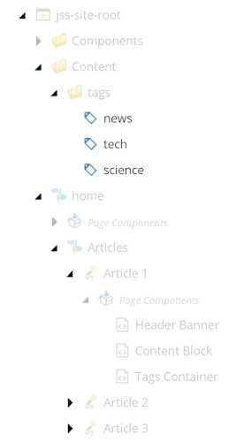 This site has a home page, an article listing page, and multiple article details pages. The article pages are tagged with arbitrary tags. To render the article details page, the following Sitecore items are needed.